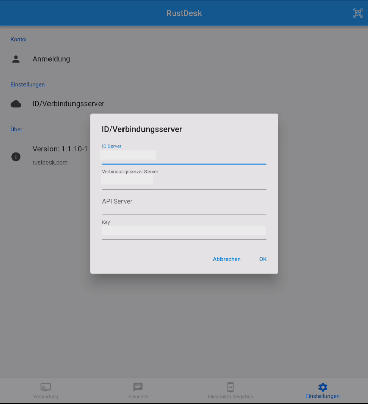 Bitte verwenden Sie das Kontaktformular für die Anfrage der Zugangsdaten für die Rustdesk Verbindung.