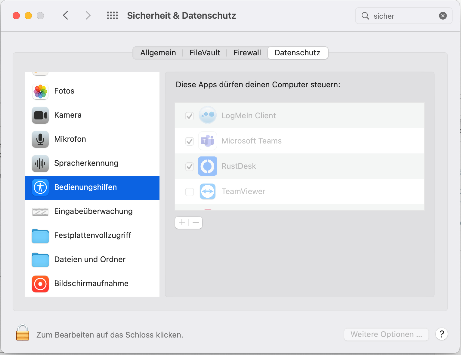 Bei MacOS müssen folgende Einstellungen in den Datenschutz Einstellungen vorgenommen werden, damit ein Zugriff von außen mit Mausunterstützung möglich ist.