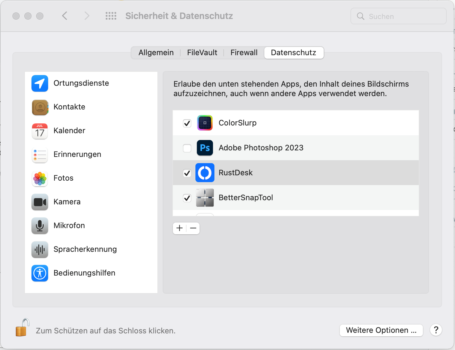 Außerdem muss unter dem Punkt Bildschirmaufzeichnung ebenfalls RustDesk aktiviert sein.