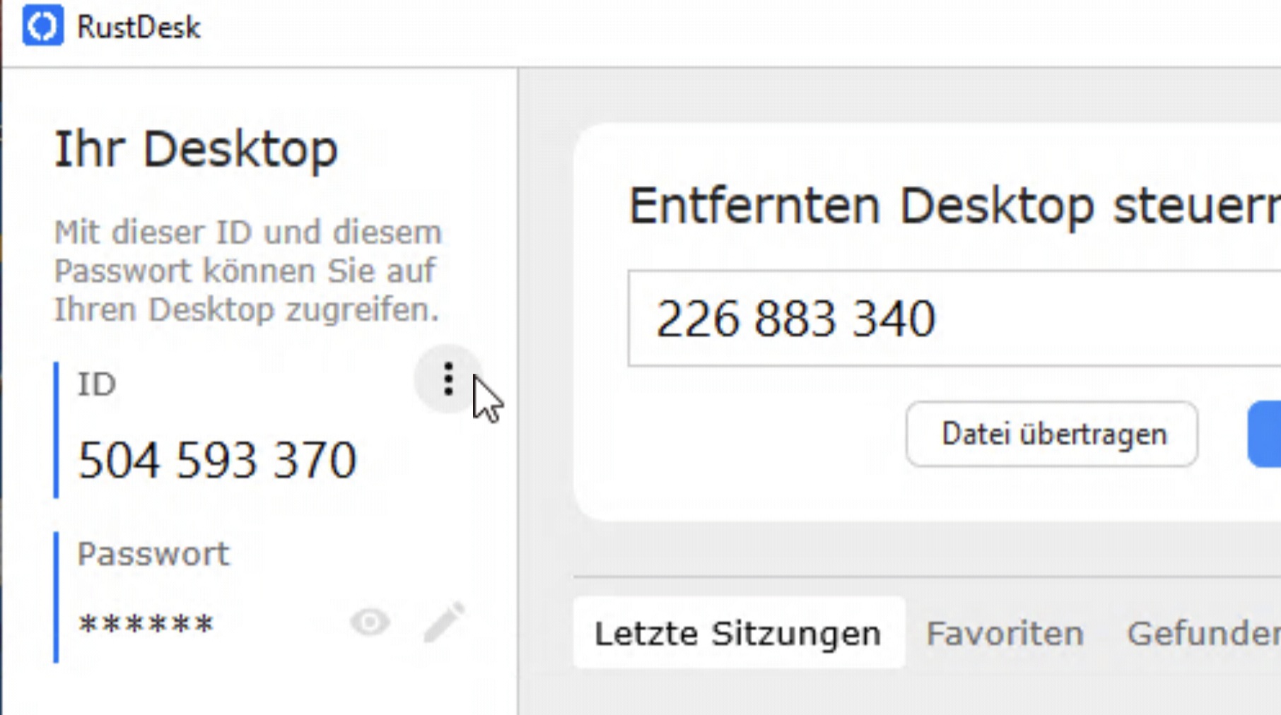Bitte verwenden Sie das Kontaktformular für die Anfrage der Zugangsdaten für die Rustdesk Verbindung.