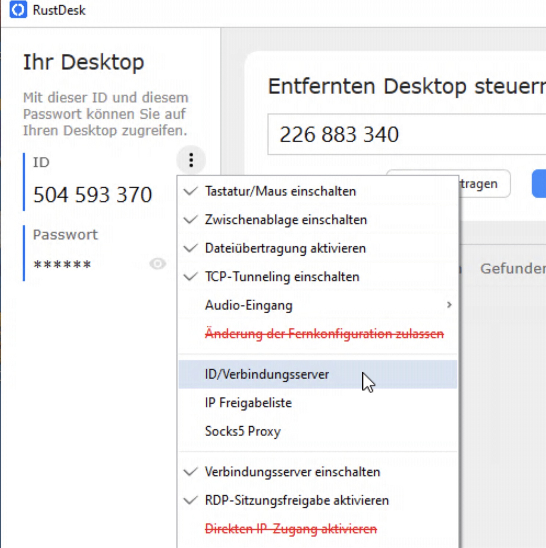 Über den Menüpunkt ID/Verbindungsserver wird der Server eingetragen, der für die Verbindung mit anderen Desktop nötig ist.