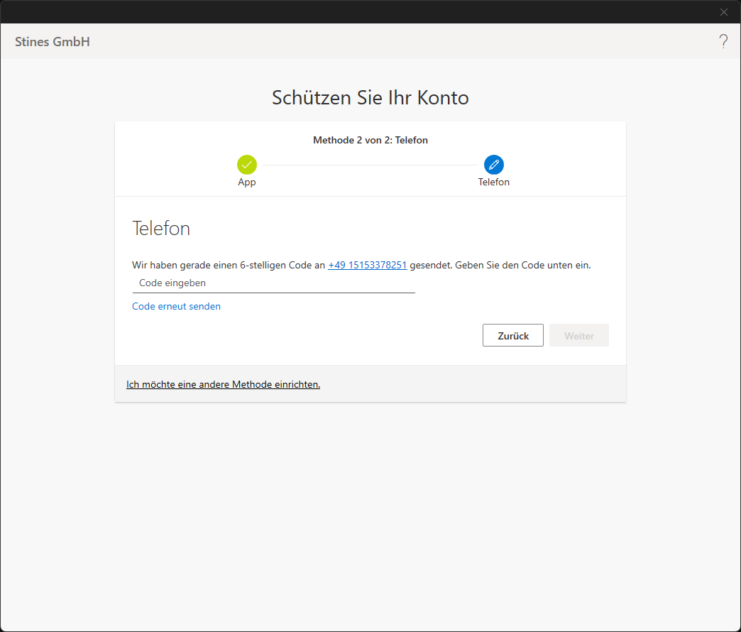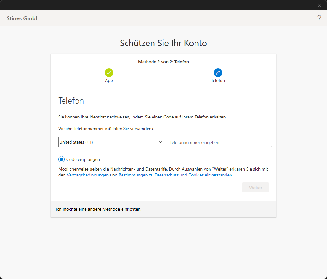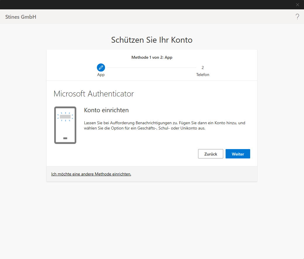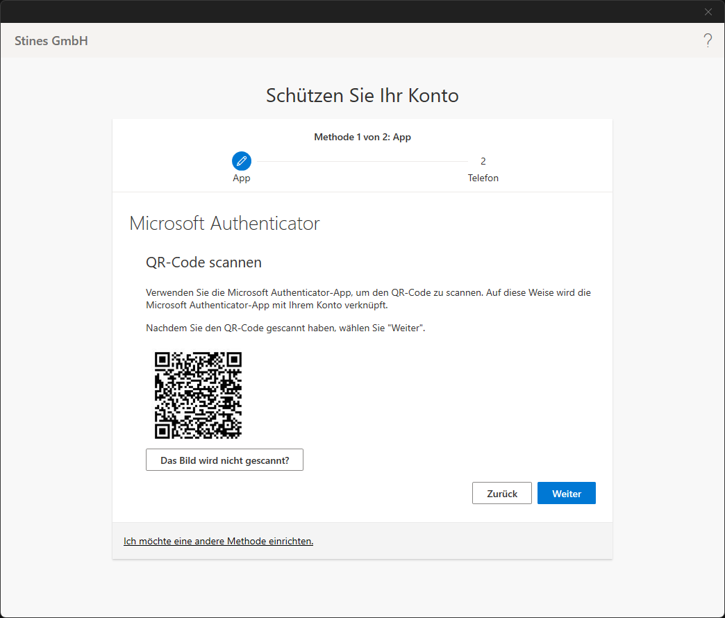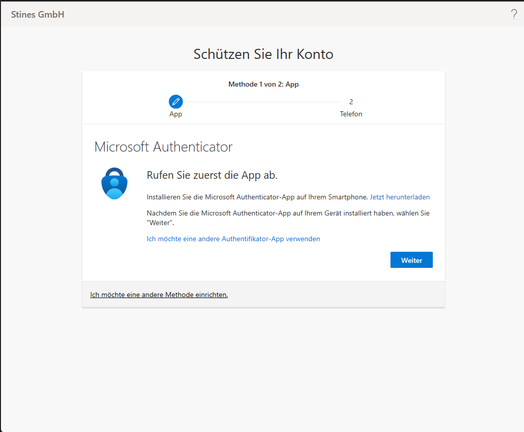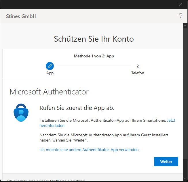 In diesem Fenster müssen Sie entweder die Microsoft Authenticator App über Weiter wählen, oder wenn Sie einen eigenen Authenticator besitzen über den Punkt „Ich möchte eine andere Authenticator-App verwenden“ wählen.
